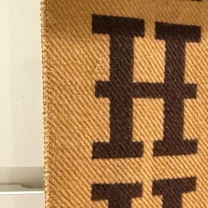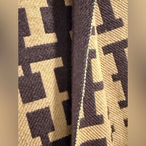 This is a brown and camel logo scarf w fringe. There is no care tag on it. It is very soft, mid weight, it has the texture and feel of a cashmere blend. Reinforced stitching around the border and fringe at both ends. Super cozy