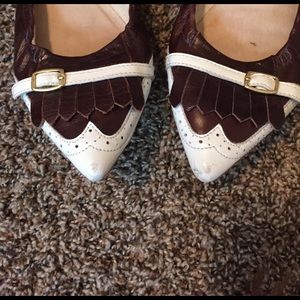 Brown and white buckle flats