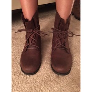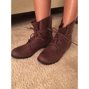 Brown faux leather ankle boots. Size 6 and fit true to size. Good condition, just a few dirt scuffs on the toes. Price is firm. Originally purchased for $34.95 from JustFab.
