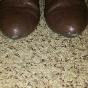 One strap , gold buckle, calf length scrunched boots. Small wedge, worn a couple times, does has wear on the heels and toes, but are in good condition.