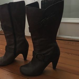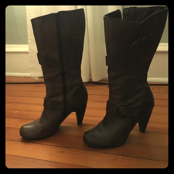 Brown leather mid calf high heeled boots. Min wear