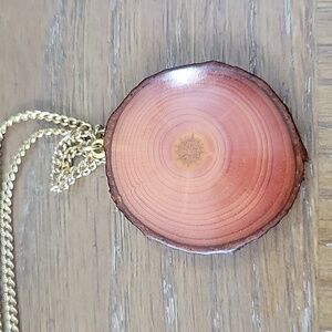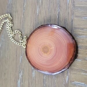 Elegant gold tone chain necklace featuring a unique brown wooden pendant. Perfect for adding a touch of sophistication to any outfit.