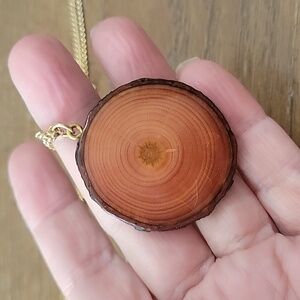 Brown circlular wooden Pendant Necklace with long gold tone chain