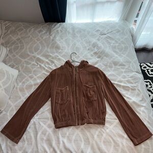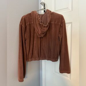Brown cropped jacket. Feels like velvet/has pockets + hoodie. Flared sleeves