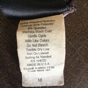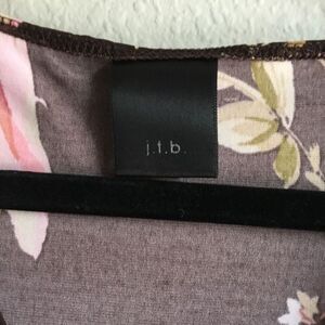 Form fitting top with brown background and orange pink and mossy green floral. V neck fitted. J.i.b. tag size Medium.
