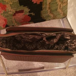 adorable brown crossbody bag with a laser cut design and a gold chain strap.