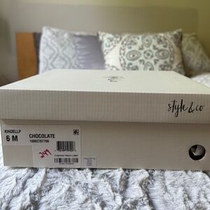 Manmade brown upper with zippers. Less than 1” heel.
