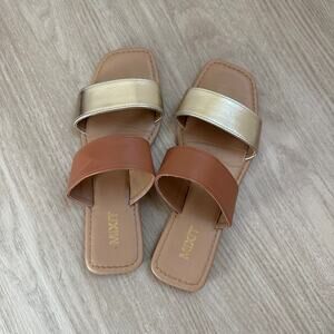 DETAIL: brown and gold double strap flat sandals with square toe. Cute 90s style