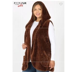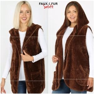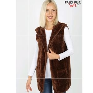 HOODED FAUX FUR COCOON VEST WITH SIDE POCKETS