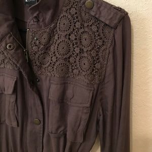 Super soft, light weight brown jacket with crochet detail and drawstring to cinch waist