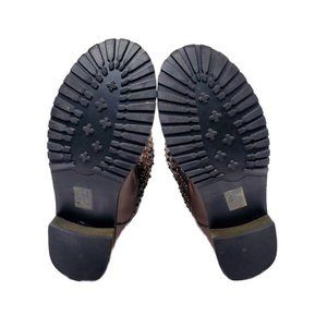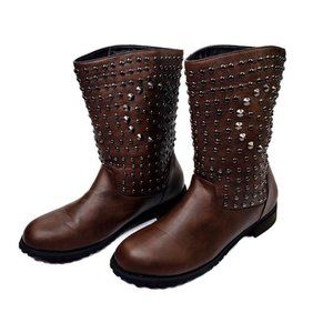 Brown leather boot highlighted by a studded design with a low block heel. *** New without tags and box ****