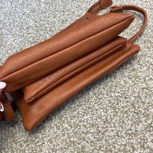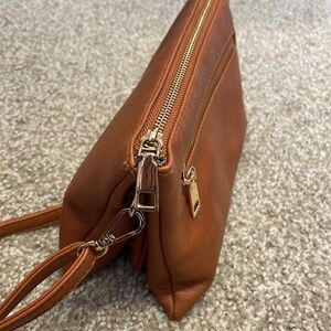 Brown leather cross body bag. Come with extra strap to be worn as clutch. Really cute and offers 3 compartments and zipper compartment on outside. There is no brand name on it.