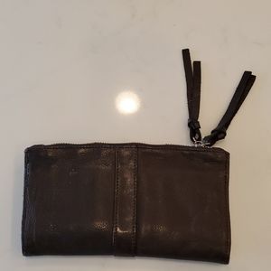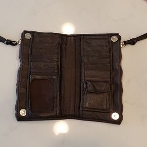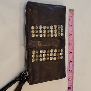 Quality brown leather wallet with fun metal details. 2 zippers. lots of credit card storage. like new.