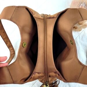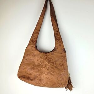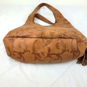 Brown patterned leather boho shoulder bag zipper snap closure tassel festival