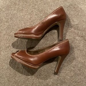 Brown peep-toe shoes with stitching detail. Only worn a few times.
