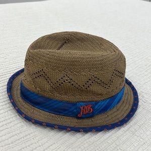Brown raphia, Fedora Hat with blue ribbon and orange details around in Size L…