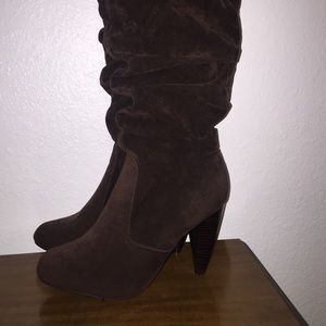 Super cute brown heeled boots. NEVER WORN! New with tag! Suede material. 2 inch heel. Zipper on inside of boot.