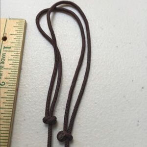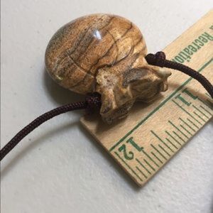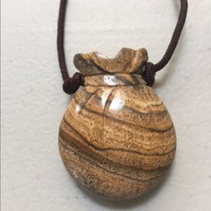 16 inches or longer with adjustable cord in brown. Very unique stone carved into a pouch with pretty detail.
