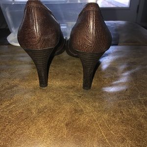 Brown heels with an alligator texture in the material.