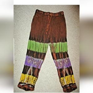 STYLE: UMBER BROWN TIE DYE LOOK WITH FLORAL AND PALM TREE OUTLINE EMBROIDERY AND PINK, BLUE, GREEN, PURPLE, AND YELLOW RAINBOW LIKE ACCENTS SHORT SLEEVE LONG BODY TUNIC TOP AND MATCHING ELASTIC STRETCH TIE WAIST TWO FRONT SIDE POCKETS CROP PANTS UNIQUE AND FUN HIPPIE OUTFIT. 100% VISCOSE. APPROXIMATE MEASUREMENTS ARE; TOP: ARMPIT TO ARMPIT ACROSS THE FRONT MEASURES 26 INCHES, SHOULDER SEAM TO HEM IS 33 INCHES. PANTS: WAIST 26-44 INCHES, HIPS 46 INCHES, RISE 13 INCHES, AND INSEAM 27 INCHES.