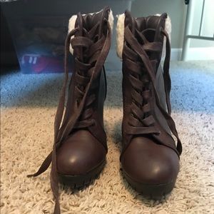 Brown booties you can wear in the winter or in the fall/summer, worn once! Paired super cute with a dress or a pair of jeans. Size 7!
