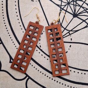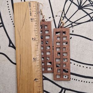 Brown wood earrings rectangular hollowed out drop carved skyscraper earrings