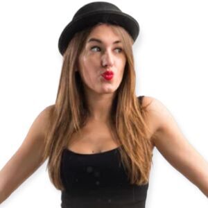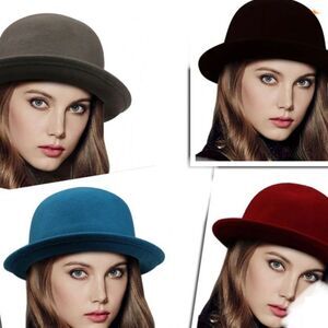 Bowler hat! Also called a derby hat, the bowler is defined by its stiff texture, dome-shaped crown, and small brim that lightly curves upward.
