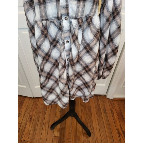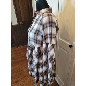Brown and cream plaid, flannel babydoll button up tunic/mini dress. Dress features empire waist, balloon sleeves, and cozy, flannel fabric.