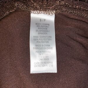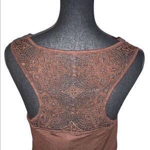 Brown asymmetrical summer dress. Sleeveless. Drape neck. Crochet racerback. Elastic waistband with drawstring. Body: 95% rayon/5% spandex. Trim: 100% polyester. Size: small. Preowned in good condition.
