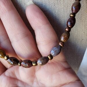 This necklace is made with brown & bronze color glass beads.