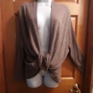 Cardigan is a light Brownish Green color like Army Greens. It has multiple patterns and textures. It can be worn down or tied up for a shorter look. it is a light weight knit.