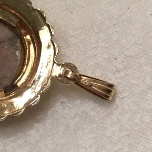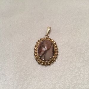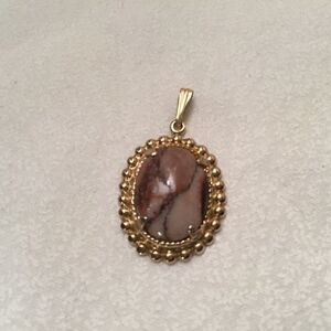 A brown and cream stone cabochon is bezel set in goldtone metal and has a rope border. It has a 1 1/4” drop including the bale and is 3/4” at its widest point. $8 each or bundle 3 of same price for $15 and save.