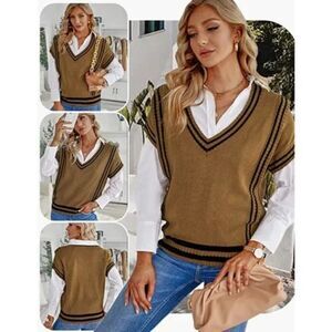 Brown Striped Knit V-Neck Oversized Sleeveless Square Pullover Sweater Vest