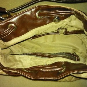 Roomy bag with light brown and tan swirls. Cloth material with silver grommets. Two slot pockets and one small zippered pocket inside. Some wear, but still good condition.