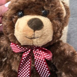 This plush teddy bear boasts a rich brown fur with a charming red bow, offering a soft and cuddly companion. Its classic design and huggable form make it a delightful addition to any toy collection.