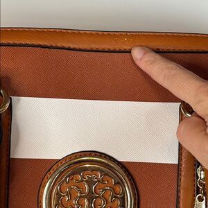 The bag has some marks and peeling on brown portion of trim. Please review photos carefully.