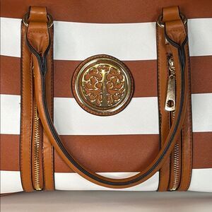 Brown and White Striped Satchel with Faux Leather Trim 15” x 7” x 9”