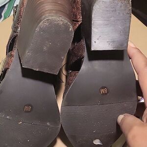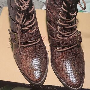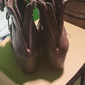 Brown cut out booties..lace up..front buckle..zipper back...excellent condition. 2.5 inch block heel