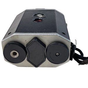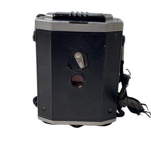 Vintage Eastman Kodak Brownie Reflex camera in black and silver. Solid pattern, made from metal and leather. Untested and sold for parts or as photography decor.