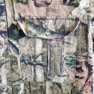 Features: cotton blend, thicker material, button flap pockets, button-down collar, mossy oak camo.