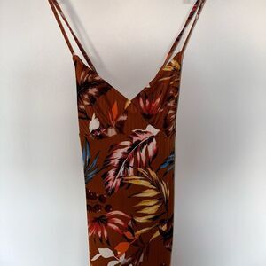 A knit maxi dress in a Hawaiian print fabric featuring a surplice neckline, sleeveless, crossed back, and a side slit.