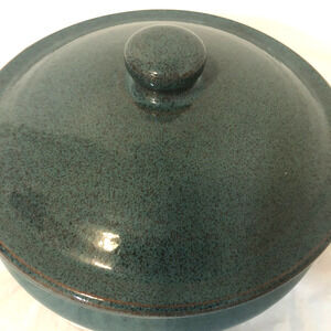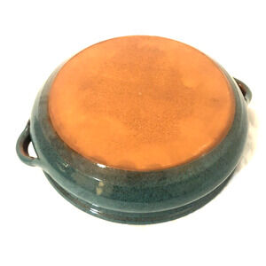 This vintage round casserole dish from Brown's Pottery is a stunning addition to any kitchen. Made of clay pottery, it features a beautiful green color and is produced in a unique art pottery style. The dish is perfect for serving your favorite dishes to your loved ones, and its double handle makes it easy to carry and serve.