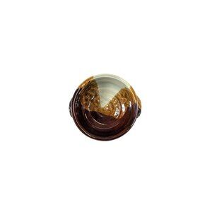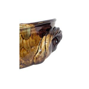 This beautiful, handmade, and signed crock / bowl is from Brown's Pottery of Arden, NC, just outside of Asheville in the Blue Ridge Mountains. This is a heavy, substantial piece of pottery, that has a great retro or vintage vibe (date of production unknown). This crock has a tricolor glaze pattern in earthy shades of spring green, chestnut, and dark chocolate, and it has a high gloss luster that reflects the light and shines. The bowl has handles and a 6" opening. This is a versatile piece that can be used for anything from holding keys and bits and bobs by the front door to serving your favorite dip at a party with loved ones.