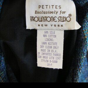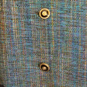 Brownstone Studio silk-blend blue plaid blazer with black trim. Blazer has red, yellow, and orange threading, black trim at collar and on both breast and both lower pockets. Smaller versions of main buttons adorn all pockets and cuffs. BRAND NEW - extra button bag still hanging from sleeve. Size 18P PTP 22”, length 29”