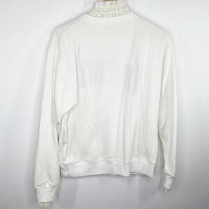 White red Southend lace detail crewneck sweatshirt. Long sleeves, pullover styling, lace trim at collar and cuffs. 66% polyester, 32% cotton, 2% polyurethane