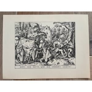 This is a book page from a 1960s reprint of Pieter Bruegel the Elder's whimsical engravings. It measures 11.5 x 8". It is on medium-bond sepia paper. Photos show the front of the book pages. Great for framing!