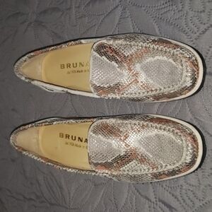 Brunate loafers Silver gold and beige leather python print 47501Dafne Gold. Confortable fit, 1" heel. Founded in 1926, the Brunate shoe factory is located in the town of the same name located at the southern end of Lake Como. Inspired by a traditional line, always updated in style and colors and with a high quality content, Brunate shoe will surprise you for the confort of the fit and the refined taste.