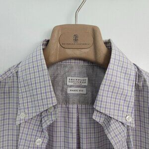 Classic Brunello Cucinelli style — a purple check basic fit shirt in 100% Italian cotton. Versatile enough for the office or weekends, and in excellent condition.