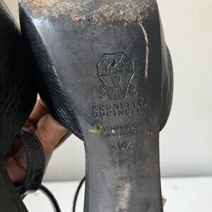 Sexy, sky high, and stunning, these Brunello Cucinelli peep toe heels are a black genuine pebbled leather. With a sweetheart vamp and T-strap that sweeps back into a cupped heel. Adjustable buckle. Platform. Wood-look chunky block heel. Cushioned insole. Made in Italy. Size IT 40.5, may fit U.S. size 10.5.