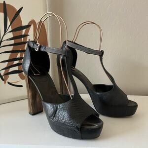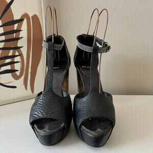 Sexy, sky high, and stunning, these Brunello Cucinelli peep toe heels are a black genuine pebbled leather. With a sweetheart vamp and T-strap that sweeps back into a cupped heel. Adjustable buckle. Platform. Wood-look chunky block heel. Cushioned insole. Made in Italy. Size IT 40.5, may fit U.S. size 10.5.